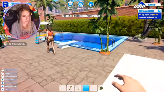03:09:54Nach dem Ende des Horror-Spiels wechselt der Stream zu einem Waterpark-Simulator. Die Streamerin übernimmt die Rolle des Park-Managers und kümmert sich um die Gäste, Einrichtungen und das Personal. Zu Beginn ist der Park noch im Aufbau und es müssen verschiedene Forschungspunkte freigeschaltet werden, um neue Attraktionen und Verbesserungen zu erhalten.