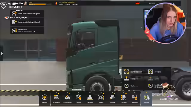 00:29:43Vorbereitung auf den angekündigten Community-Drive im Euro Truck Simulator. Der Streamer stellt fest, dass er einen eigenen LKW benötigt und diskutiert die Anschaffung mit der Community. Es geht um Kreditoptionen, Fahrereinstellungen und die Organisation der Convoy-Session, bei der alle Teilnehmer dieselben Aufträge übernehmen sollen.
