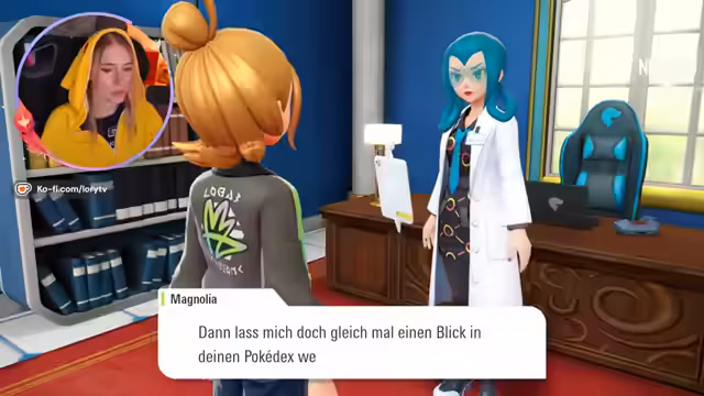 01:29:51Nachdem die ersten Pokémon gefangen wurden, erhält die Streamerin im Labor eine Forschungsaufgabe von der stellvertretenden Vektorin Magnolia. Diese Aufgaben dienen dem Aufstieg des Forschungslevels und bringen Belohnungen wie Attacken-Techniken (TMs). Plötzlich taucht Kaelin auf, der sich als Mitglied von Team MZ vorstellt und ein neues Outfit anbietet. Es wird eine kurze Unterhaltung geführt und das neue Mitglied willig unterstützt, um im Spiel voranzukommen.