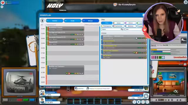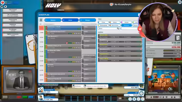 01:36:23Die Streamerin entdeckt, dass das Spiel sowohl als auch in einer kooperativen Variante gespielt werden kann, wobei jeder Spieler einen eigenen Sendeplan erstellt. Während die Planung voranschreitet, kommt es zu Fehlern, wie dem falschen Platzieren von Nachrichten und dem Kauf von ungeeigneten Inhalten wie Drama-Filmen, die die Einschaltquoten senken. Ziel ist es, das Programm für den nächsten Tag so zu optimieren, dass durch Werbung und gute Inhalte wieder ein Gewinn erzielt wird.