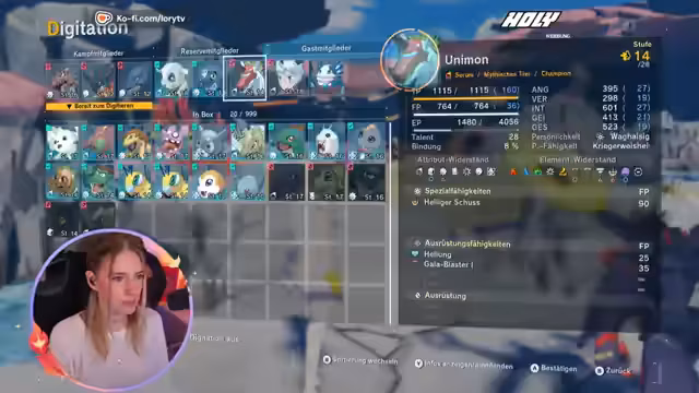 01:03:42Der Stream konzentriert sich vollständig auf das Spielen von Digimon. Die Charaktere treffen auf verletzte Dorfbewohner und entdecken einen Konflikt zwischen verschiedenen Digimon-Fraktionen. Die Geschichte wird als emotional und dramatisch beschrieben, mit Momenten der Trauer über gefallene Charaktere und der Sorge um die Zukunft des Dorfes. Die Streamerin ist von der Tiefe der Story beeindruckt und macht sich Sorgen um das Schicksal ihrer digitalen Begleiter.