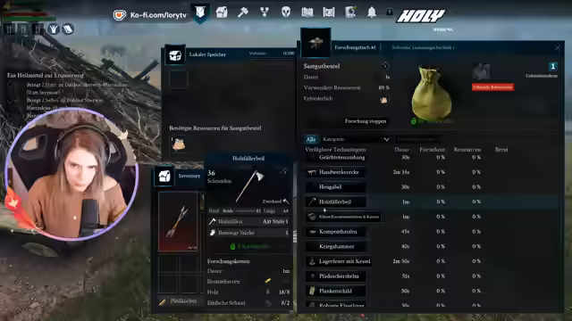 01:21:40Eine Zusammenarbeit bei der Herstellung von Gegenständen wie einem Köcher und einer Tasche gestaltet sich schwierig, da benötigte Materialien wie Schilfrohr und Hanf nicht immer verfügbar sind und das Inventar begrenzt ist. Die Kommunikation wird durch technische Störungen beeinträchtigt, da sich die Stimme des Streamers wie eine Roboterrichtung anhört. Dies führt zu Frustration, da die Ursache unbekannt ist und nach Tests mit Discord und TeamSpeak nicht behoben werden kann. Es wird spekuliert, dass das Spiel oder die Streaming-Software die Leistung beeinflussen könnte.
