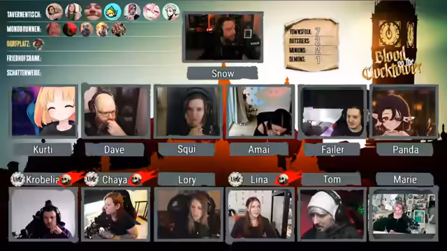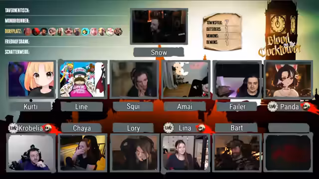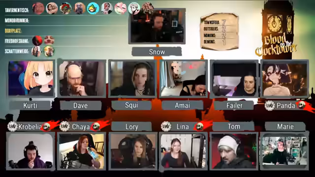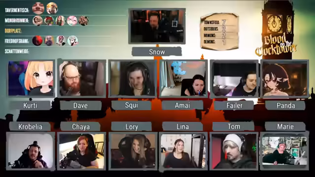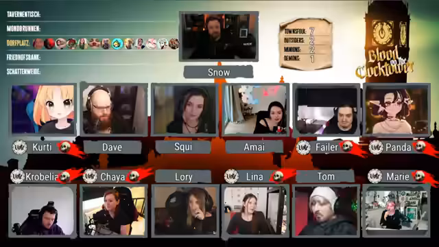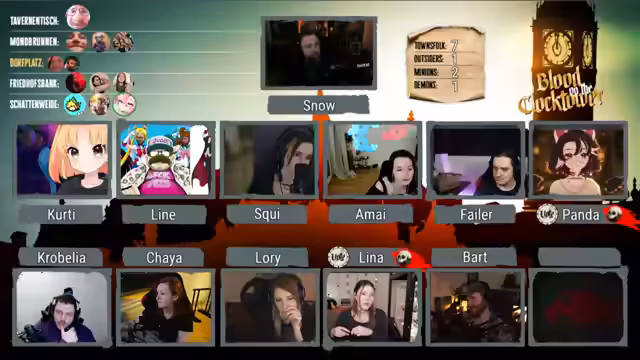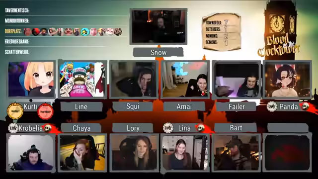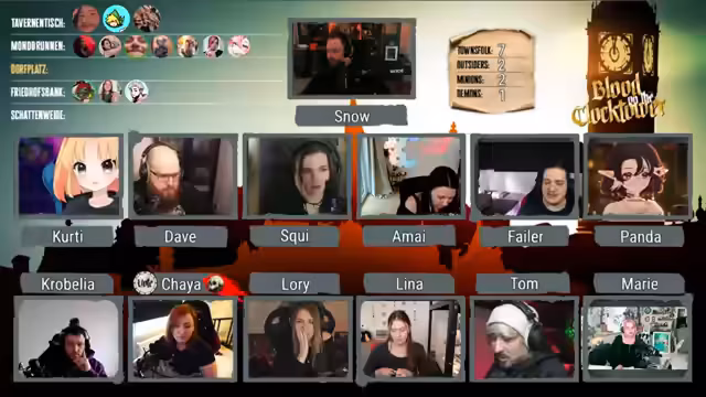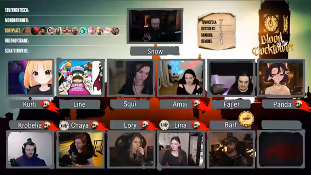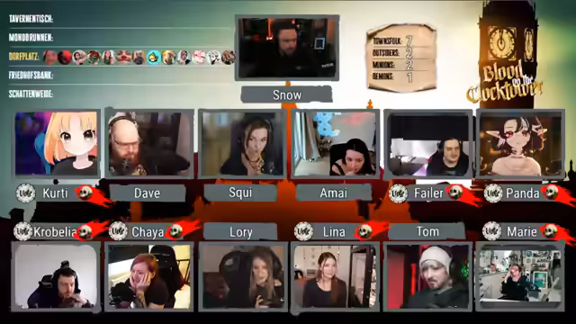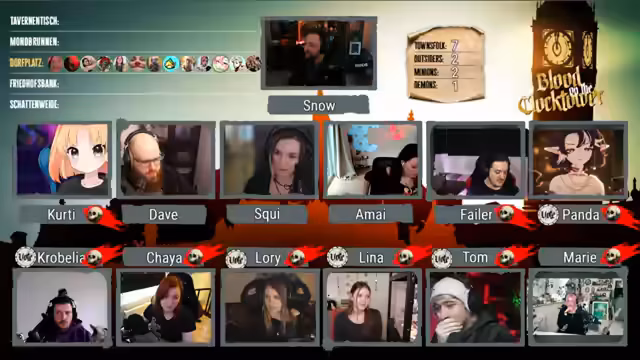 08:23:39Der Stream beginnt mit Verwirrung über eine angebliche Townrolle und die Tötungsreihenfolge. Es wird diskutiert, wie vertrauenswürdig die Informationen der Spielerin Squee sind, da sie sowohl wahre als auch falsche Informationen erhalten könnte. Eine Spielerin spekuliert, sie wäre im Falle der Rolle 'Witwe' (Widow) die gegnerische Seite mit falschen Infos versorgen. Die lange Dauer des aktuellen Tages wird thematisiert und führt zu der Frage nach der Uhrzeit im Spiel.