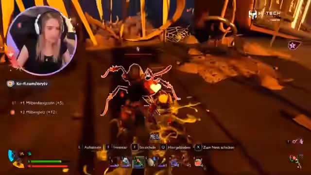 01:33:15Der Streamer betritt eine neue, dunkle Höhlenzone, in der sich vermehrt Skorpione und Spinnen aufhalten. Dabei wird er aggressiv von einem großen Skorpion verfolgt, der ihn mit Toxin attackiert. Er entscheidet, seine Ameise 'Maisie' vorübergehend nach Hause zu schicken, um sie zu schonen, und eine andere Ameise für den Kampf zu nehmen. Nach einem knappen Kampf gelingt es, den Skorpion zu besiegen, wobei er lootbare Items wie Skorpionspeere und Riegel findet. Anschließend erkundet er die Umgebung weiter und stößt auf Forschungsstationen und ein Labor. Die Entdeckung einer Basketball-Korb-Kreation wird als bemerkenswert cool bezeichnet.