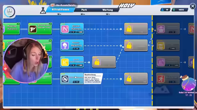 04:49:18Es werden neue Attraktionen und Verbesserungen für den Wasserpark in Betracht gezogen, darunter Schwimmbecken, Poster-Marketing zur Steigerung der Gästezahlen und Mitarbeitererholungsmaßnahmen. Es werden auch praktische Upgrades wie extra große Taschen für die Mitarbeiter und ein Kurzdistanz-Taser zur Gästekontrolle diskutiert. Die maximale Anzahl an Mitarbeitern soll erhöht werden. Ein neues Schwimmbecken wird ausgewählt und platziert. Es wird eine Jukebox gekauft, um die Stimmung im Park zu verbessern. Es wird nach Reinigungskräften gesucht und Anno wird als neuer Mitarbeiter eingestellt. Es wird festgestellt, dass es Personal für die Kasse, Reinigung und Rettung gibt, was die Situation entspannt. Es wird beobachtet, wie die Gäste die Rutschen nutzen und es wird versucht, verlorene Gegenstände zurückzugeben. Eine defekte Rutsche wird abgerissen, um Unfälle zu vermeiden. Es werden Limonaden und Hotdogs verkauft und es wird bei Problemen im Park geholfen.