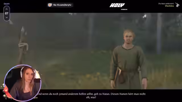 00:51:44Nach den längeren Interaktionen mit der Community und den Werbeblocks startet die Streamerin mit dem Gameplay von 'Kingdom Come: Deliverance', Tag 6. Charakteristisch für ihren Spielstil ist die ausgiebige Interaktion mit der Spielwelt und den NPCs. So überfällt sie einen Banditen, plündert dessen Körper und hilft anschließend einem Adligen, der aus dem Kerker geflohen ist, mit einer kleinen Geldspende. Dabei wird auch der humorvolle Umgang mit dem Hund im Spiel erwähnt.