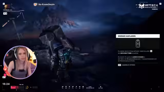 00:59:46Die Streamerin muss nun die Überleben der sichern. Sie erkundet die Umgebung ihrer Basis und beginnt, Ressourcen wie Metall und organische Stoffe zu sammeln. Sie baut einen ersten Bergbauposten, der mit der Basis verbunden ist, um schneller an Ressourcen zu gelangen. Zeit ist ein kritischer Faktor, da sie erschöpft werden kann und die Erholungszeiten verlängern, zudem steigt nachts die Strahlung, was die Exploration unmöglich macht.