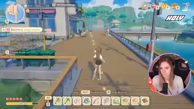 02:27:55Der Stream beginnt damit, dass die Streamerin feststellt, dass eine der Spielfiguren noch schläft, obwohl es bereits 7:44 Uhr ist. Sie erkundet die Umgebung mit einem Skateboard und entdeckt einen Ort, an dem Klamotten ausgelegt sind. Sie wundert sich, warum bisher keine männlichen Charaktere kennengelernt wurden und beginnt, durch die Gegend zu laufen, um neue Figuren zu treffen. Ein Charakter freut sich über ein Geschenk, eine sogenannte "Beere", was der Beginn der sozialen Interaktion im Spiel ist.