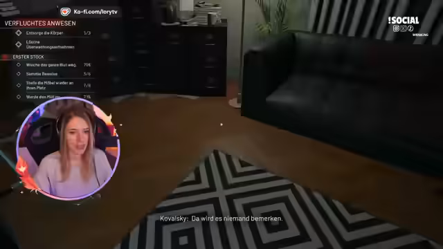 01:32:33Nach Abschluss der ersten Aufgabe wechselt die Streamerin zu einem neuen Spiel. Sie übernimmt die Rolle eines Hackers, der ein Smart Home manipuliert hat, um die Bewohner einzuschüchtern, indem er es wie ein Spukhaus erscheinen lässt. Ihr Auftrag ist nun, das Chaos zu beseitigen. Im Verlauf des Spiels wird sie von unheimlichen Geräuschen und Gruseleffekten überrascht und fühlt sich in die fiktive Rolle hinein, wobei sie die Realität und das Spielgefühl vermengt.