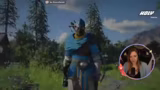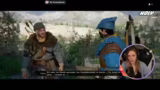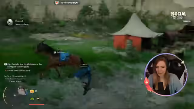 01:03:57Nach dem Entschluss für das Highspeed-Rennen beginnt die eigentliche Gameplay-Phase. Die Streamerin steuert ihren Charakter durch die Spielwelt, sammelt Ressourcen wie Kupfererz und Nahrungsmittel (unter anderem Trockenfleisch) und interagiert mit der Umgebung. Eine Schlüsselszene findet in einem Dorf statt, in das sie per Schlüssel eindringt. Dort findet sie eine vollständige Küche mit Zutaten wie Milch, Brot und Wasser. Sie wird jedoch fast von einem Bewohner entdeckt und muss sich vorwerfen lassen, dass sie zum Klauen hier ist, woraufhin sie eine Kupferstrafe zahlen muss, um eine Anzeige zu vermeiden.