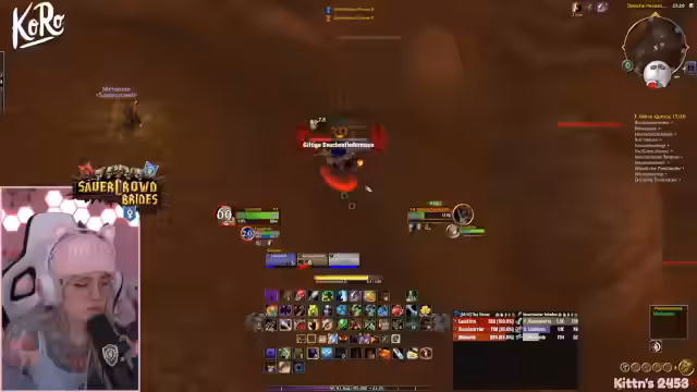 08:29:25Die Positionierung für den Bosskampf wird in der Mitte hinter dem Boss festgelegt. Der Streamer pullt den Boss, wird aber kurz darauf gebanischt. Gucci übernimmt sofort den Tank, während der Streamer an Lewander vorbei einen Ersatz-Tank holt. Nach erfolgreicher Bewältigung der Mechanik wird der Boss getötet und ein questrelevanter Gegenstand sowie ein Trinket gelootet. Die Quest wird direkt abgegeben und ein Screenshot vor der Leiche wird als Erinnerung erstellt, bevor die Gruppe den Instanzverlass plant.