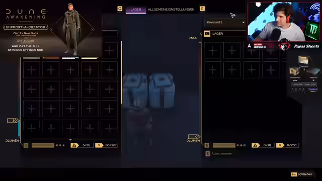 06:32:48Der Streamer konzentriert sich auf den Wiederaufbau seiner Basis, insbesondere nachdem Probleme mit dem Buggy und dem Rechner aufgetreten sind. Er diskutiert über die Notwendigkeit von Ressourcen wie Suspensern, Batterien und Holzmanschilden. Dabei wird das Inventar organisiert und geplant, wie Materialien zwischen den Standort transportiert werden können. Der Fokus liegt darauf, die Basis mit notwendiger Ausrüstung und Energieversorgung wiederherzustellen.