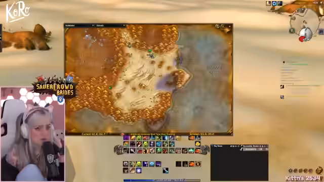 05:13:53Nachdem ein Elitegegner das Questfortkommen in einer Region blockierte, wird als nächstes Silithus ins Auge gefasst. Dieses Gebiet links unten wird als Endgebiet beschrieben, reich an Käfern und anderen Insekten. Der Weg dorthin führt zunächst durch Tanaris. Die Streamerin erkundigt sich nach dem weiteren Verlauf einer speziellen Quest, die sie in Silithus oder Un'Goro fortsetzen möchte, um Erfahrungspunkte zu sammeln. Sie erwähnt die Möglichkeit, dass Meloni, eine weitere Spielerin, in Silithus weitermachen könnte, während sie selbst Un'Goro anvisiert.