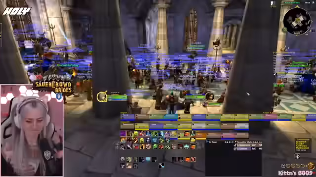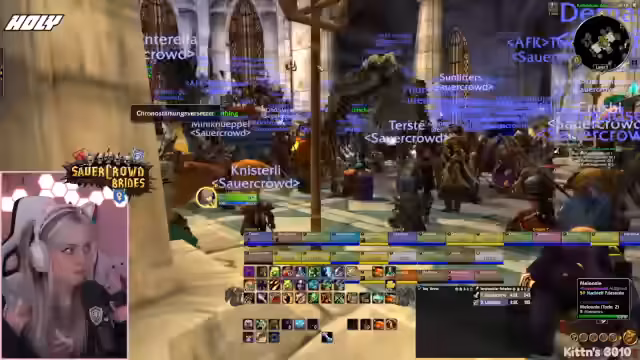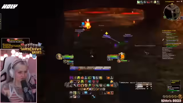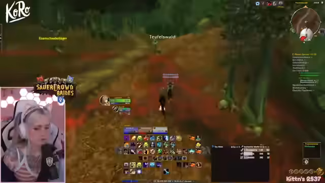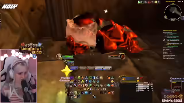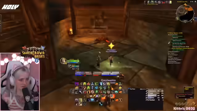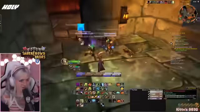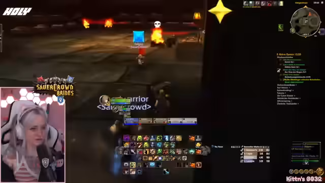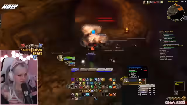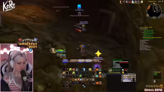 09:49:42Vor dem Einstieg in den Dungeon werden die letzten Vorbereitungen getroffen. Die Streamerin prüft ihre Ausstattung, tauscht ihre Talente aus und stellt sicher, dass alle wichtigen Quests, insbesondere für den Schlüsselzugang zum-instance, erledigt sind. Sie koordiniert den Treffpunkt und versucht, alle Mitglieder der Gruppe zu sammeln, während sie selbst durch eine gefährliche Passage navigiert.