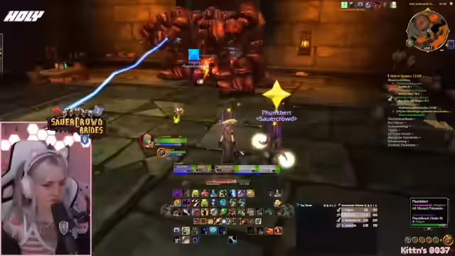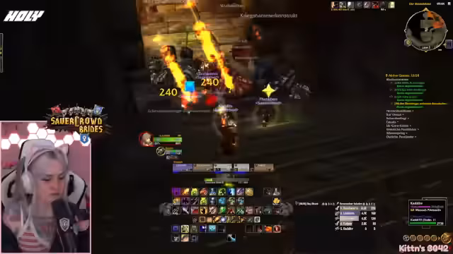 10:12:48Der Dungeon läuft. Die Streamerin, in ihrer Rolle als Heiler, beschreibt den Kampfverlauf. Sie gibt Anweisungen zum Agro-Management, zum Pullen der Gegner und zur Heilstrategie. Der Fokus liegt darauf, die Mobs kontrolliert zu bekämpfen und einen geordneten Ablauf zu gewährleisten, um den Erfolg der Gruppe zu sichern und Unfälle zu vermeiden.