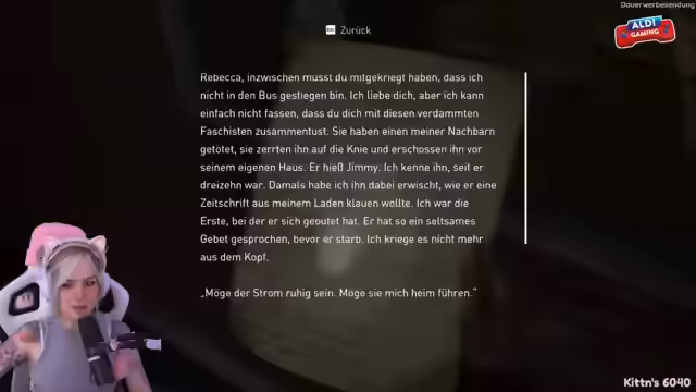 09:21:01Die Streamerin erfährt während der Erzählung über Paiges Tagebuch, dass diese eine Verbindung zu den Fireflies hat. Es wird offenbart, dass Paige von den Fireflies entdeckt und als Sünderin gebrandmarkt wurde. Der Inhalt des Tagebuches deutet darauf hin, dass Joel die Immunität von Ellie bekannt war und dass es möglicherweise andere Immune gibt, die sich verbergen. Dies wirft Fragen über Joels Motivation auf, als er Ellie aus der Klinik rettete.