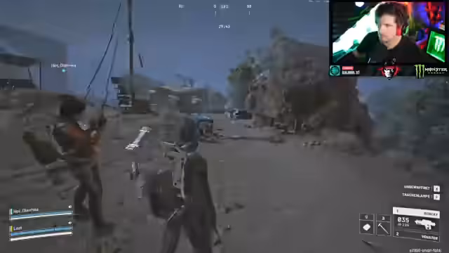 02:37:21Der Streamer positioniert sich im Nahkampf. Er beschäftigt sich mit einem gegnerischen Spieler, der stark ausgerüstet erscheint („stacked“). Er erwähnt, dass zwei Gegner im Solo-Modus sind und es „unlucky“ findet, dass ihm das Spiel keinen Vorteil gibt. Er schlägt einem anderen Spieler vor, sich zu verbünden, um PvE zu machen, doch der lehnt ab. Der Streamer kämpft gegen einen Gegner, der sich in einem Loch verschanzt hat („Bunkerbude“), und schießt ihn nach einem längeren Duell nieder.