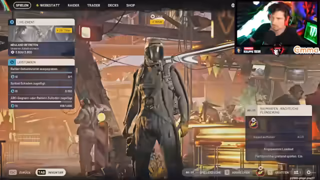 06:40:35Die Runde beginnt in einem dynamischen Kampfgeschehen innerhalb von ARK Raiders. Der Streamer navigiert durch Map-zweck, kommuniziert mit seinem Team über Positionen und Gegner, und sucht nach Loot und Ausrüstung. Er berichtet über den Zustand seiner Munition, health und das Ziel, Ressourcen zu verkaufen, um Kapital für den nächsten Einsatz zu generieren. Das Gameplay ist von Taktiken wie Hinterhalten, dem Schalten von Gegnern und dem Verwalten von Inventar geprägt, was einen typischen Battle Royale-Verlauf widerspiegelt.