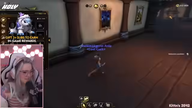 00:59:13Nach Erreichen von Level 90 konzentriert sich die Streamerin darauf, Ausrüstung durch World Quests und das neue Jagdsystem zu verbessern. Sie nimmt eine Jagd an und erklärt, dass man für die Jagd World Quests auf der Karte erledigen muss. Ein Fortschrittsbalken füll sich durch das Töten von Gegnern und Sammeln von Objekten. Nachdem der Balken gefüllt ist, müssen die Objekte an speziellen Altären abgegeben werden, um die Jagd abzuschließen und Belohnungen zu erhalten.