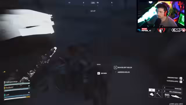 05:29:13Die Spieler befinden sich in einem intensiven Gefecht, bei dem sie versuchen, ihre Positionen zu halten und den Gegner zu verwirren. Es wird von einer "Pussy-Teiligungs-Stellung" gesprochen, die jedoch nicht dauerhaft gehalten werden kann. Ein Spieler wird als "runtergetrunken" beschrieben, was auf einen schnellen Angriff hindeutet. Die Kommunikation konzentriert sich auf die Bewegungen des Gegners, der von verschiedenen Seiten angreift, und die Notwendigkeit, auf die eigene Position aufzupassen. Es werden Granaten geworfen und Positionen ausgebaut, um den Druck aufrechtzuerhalten. Die Drohne nimmt weitere Teams wahr, was die Komplexität der Situation erhöht. Die Spieler müssen aufpassen, nicht zwischen zwei Teams zu geraten, während sie versuchen, ihre Gegner auszuschalten und gleichzeitig die Umgebung zu nutzen, um Verwirrung zu stiften und taktische Vorteile zu erzielen.