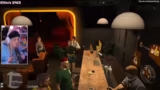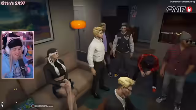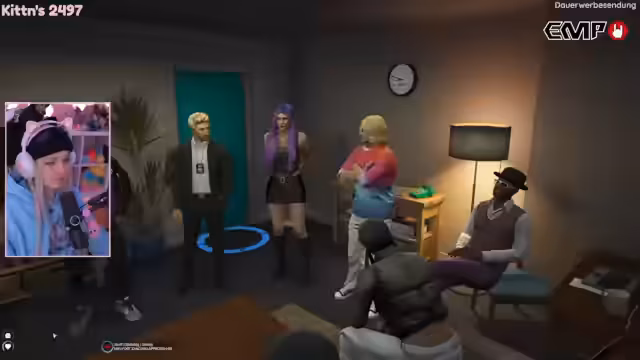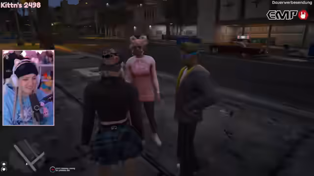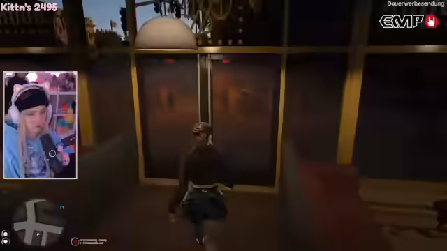 07:17:18Die Streamerin befindet sich im 'Ground and Pound', einer fiktiven Location im Spiel. Sie interagiert mit einer anderen Person namens Karolina, die sich offenbar ebenfalls dort aufhält. Es kommt zu einem weiteren Missverständnis, als Karolina annimmt, die Streamerin arbeite hier. Diese klärt auf, sie warte nur noch. Kurze Zeit später treffen sie sich mit einem Zuschauer namens Bullock. Es folgt ein Rollenspiel, bei dem die Streamerin als Lucy, die Schwester von Bullock, agiert und versucht, eine Bestellung aufzugeben. Die Situation wirkt durch den ungewohnten Auftritt komisch und unkoordiniert.