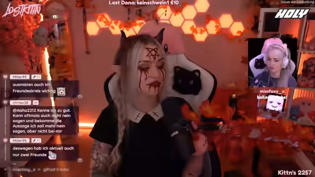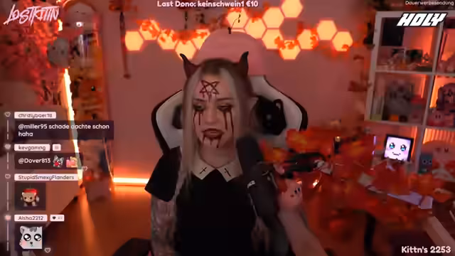 02:13:39Die Streamerin beginnt, ihr Halloween-Make-up zu erstellen, wobei sie verschiedene Schritte zeigt und über Entscheidungen für das Make-up spricht. Sie probiert blaue Kontaktlinsen, merkt jedoch, dass diese ihre Sicht stark beeinträchtigen und sie daher wieder herausnimmt. Sie entscheidet sich, stattdessen ein Dämonen-Make-up zu gestalten, wobei sie hauptsächlich schwarze und rote Farben verwendet. Währenddessen erwähnt sie ihre Pläne für das folgende Halloween-Event in Köln, bei dem sie mit Mori zusammen sein wird und kündigt an, demnächst rote Kontaktlinsen zu verwenden. Dabei erwähnt sie auch, dass sie nächtens keine Horrorfilme schaut, da sie dazu zu ängstlich ist.