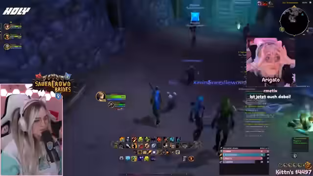 07:46:29Das Stream-Team bereitet sich auf den Dungeon-Einstieg vor. Der Streamer ist etwas besorgt, ob die aktuelle Waffe schon vollständig ausgerüstet ist und erläutert die Bedrohung durch Stuns durch Mobs. Ein kurzes Gespräch über die Anordnung der Gruppe findet statt, um sicherzustellen, dass alle bereit sind, den nächsten Bossangriff zu starten.