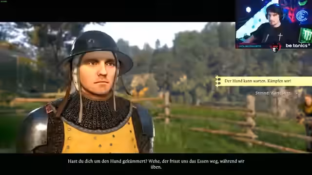 01:39:39Das Spiel beginnt ohne Tutorial in einem Kriegsszenario. Der Streamer steuert seinen Charakter in einem Gefecht und nutzt eine Armbrust. Nach erfolgreicher Abwehr des Angriffs wird ein wichtiges Training mit dem Schwert eingeleitet, bei dem grundlegende Angriffs- und Blockmechaniken gezeigt werden.