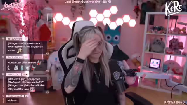 01:54:40Ein incident mit der Rasur der Glatze wird humorvoll geschildert. Der Streamer berichtet, dass man erst beim Tragen einer Glatze feststellt, ob der Kopf 'dafür geformt' ist. Diese Diskussion über äußeres Erscheinungsbild wird mit spielerischen Elementen verbunden, wie dem Rollen für einen Ring und der Herausforderung, Princess zu spielen, wenn noch nur ein Tank da ist.