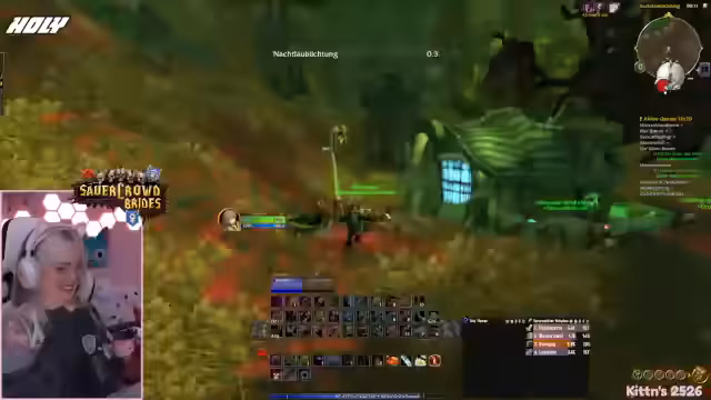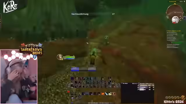 05:07:26Es kommt zu einer spontanen Gruppenbildung, als ein Spieler, Crespi, Hilfe benötigt, um einen speziellen Mob im Teufelswald zu besiegen. Die Streamerin und ihre Gruppe unterstützen ihn und laden ihn in ihre Gilde ein. Anschließend grinden sie gemeinsam, um Ruf zu farmen und Erfahrungspunkte zu sammeln, während die Streamerin den Chat über die aktuellen Aktivitäten und die Vorteile des Spots auf dem Laufenden hält.