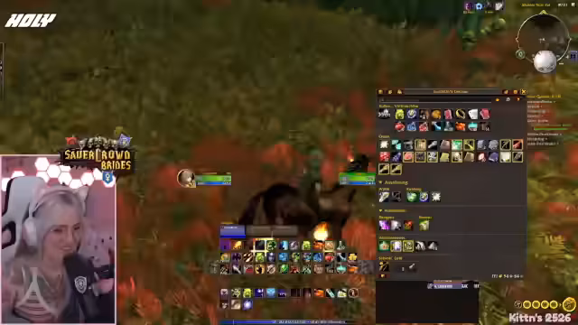 05:27:04Die Streamerin kämpft mit ihrem Inventarplatz, da sie mehrere Gegenstände aus einer Gilden-Quest tragen muss, die sie davon abhält, die Quest überhaupt anzunehmen. Sie versucht, Platz zu schaffen, indem sie andere Gegenstände wie Teufelsstoff abgibt und mit Chat-Mitgliedern über die Weitergabe der Gegenstände und deren Nutzen für die Ruffarmen diskutiert.