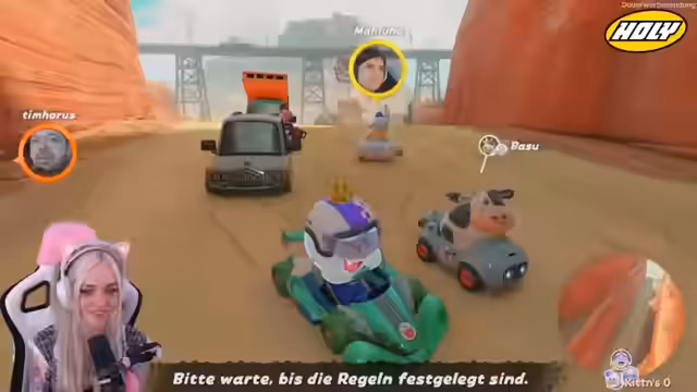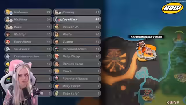 03:18:50Das Gameplay war geprägt von hoher Unvorhersehbarkeit und Pech, was von den Spielern humorvoll als 'Reizüberfüllung' und 'Bug' beschrieben wurde. Positionen schwankten extrem, von Platz eins auf elf und wieder zurück, oft durch Items wie Bomben oder blaue Panzer verursacht. Zwischen den Rennen wechselten die Spieler ihre Charaktere, wobei Themen wie die 'Team-Kuh'- oder 'Team-Peach'-Zugehörigkeit aufkamen. Die Biene und der Frosch wurden als beliebte Charaktere erwähnt.
