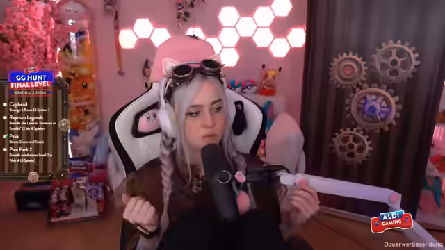 02:15:22Die Vorbereitung auf das finale Level des Aldi Gaming GG Hunt Events nimmt einen großen Teil des Streams ein. Die Streamerin, als Teil des Aldi-Gaming-Teams, äußert ihre Nervosität, ob die Technik reibungslos funktionieren wird. Sie gibt genauen Anweisungen für den geplanten Ablauf: einen 15-minütigen Countdown, Giveaways auf dem Aldi-Kanal und die Challenges, die ihre Gruppe absolvieren muss, um das 'Good Game für alle' freizuschalten.