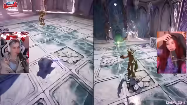 04:05:11Die Spielerinnen befinden sich in einem intensiven Bosskampf gegen den Eiskönig, der sich als forderndes Duell mit mehreren Phasen entpuppt. Nach anfänglichen Schwierigkeiten beim Timing der Angriffe gelingt es ihnen durch koordinierte Aktionen wie das Abfeuern von Projektilen während Schutzschild-Phasen, den Gegner zu bezwingen. Der Kampf erinnert an RPG-Mechaniken mit teils chaotischen Elementen, die volle Konzentration erfordern.