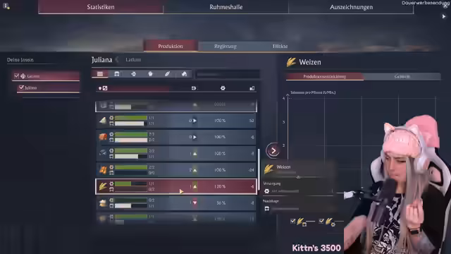 05:39:29Der Streamer findet großen Gefallen an Anno 117 und beschreibt das Spielerlebnis als „super cozy“, da das Aufbauen und Entdecken viel Spaß bereitet. Es wird die Mechanik des weißen und grünen Balkens erklärt, wobei der weiße Balken den Bedarf und der grüne die aktuelle Produktion anzeigt. Ein optimaler Zustand ist erreicht, wenn beide Balken gleich sind, was bedeutet, dass die Produktion den Bedarf deckt. Es wird klargestellt, dass Bretter nur zum Bauen benötigt werden und nicht von den Einwohnern nachgefragt werden, während Holz für die Produktion von Gütern essenziell ist. Die Wichtigkeit des Verständnisses dieser Zusammenhänge wird betont, um die Effizienz der Produktion zu gewährleisten. Der Streamer lernt, wie man den Überblick über die Produktionsketten behält, indem man auf die Gebäude klickt, um den Bedarf und Überschuss zu sehen. Es wird festgestellt, dass zu viele Schafe produziert werden und ein Mangel an Weizen besteht, was Anpassungen in der Landwirtschaft erfordert.