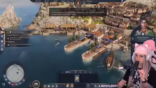 06:33:26Die Funktion von Handelsrouten zwischen Inseln wird erklärt, um Waren effizient zu transportieren und einzustellen, wie viel aus einem Lager in ein anderes verlagert werden soll. Der Streamer muss weiterhin Garum produzieren und plant, weitere Arbeiter anzusiedeln. Die Platzierung von Häusern und die Ästhetik der Stadt werden diskutiert, wobei auch breitere Straßen als vorteilhaft für den Transport angesehen werden. Eine neue Quest erfordert die Ausrichtung eines Festes für Ceres in der Stadt Juliana, um die Frömmigkeit und Verehrung der Bürger zu ehren. Der Streamer entscheidet sich, das Fest zu unterstützen und fragt, ob man sehen kann, wie die Bürger feiern. Es wird festgestellt, dass die Geburtstagsfeier für die Schwiegermutter, Julia, weiterhin im Fokus steht und Garum für ihre Gäste auf das Schiff geladen werden muss. Es wird erklärt, dass nicht alle Bedürfnisse der Bewohner erfüllt werden müssen, um die nächste Stufe zu erreichen. Der Streamer entscheidet sich für die Forschung von Pflastersteinen, um schnellere Wege zu ermöglichen. Die Zeit vergeht schnell beim Spielen von Anno, und der Streamer beschließt, nach der Geburtstagsfeier für heute Schluss zu machen, da ein wichtiger Tag bevorsteht. Das Spiel wird gespeichert als „Kittens Imperium X3“. Der Streamer äußert sich positiv über das Spielerlebnis und die Unterstützung der Community. Anno 117 wird als sehr einsteigerfreundlich und spaßig empfunden, was eine positive Überraschung für den Streamer ist, der sich zuvor nicht als Strategie-Spieler sah. Der Stream endet mit einem Raid zu Papo und einem Dank an die Community.