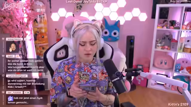 02:34:57Der Stream wird unterbrochen, als die Streamerin ihre Wäsche waschen muss, während ihre Katze Happy ihr ständig in die Aktionen hineinplatzt. Die Katze ist ein ständiger und amüsanter Begleiter, schläft sogar in den Kleidungsstücken und sorgt für zwangsläufige Unterbrechungen. Die Streamerin spricht über die anstehende Reise und verspricht ihren Katzen Hippie und Bubbles, sie nach ihrer Rückkehr in den Armen zu halten. Der Fokus auf die Haustiere zeigt die familiäre und unkomplizierte Atmosphäre des Streams und die Verbundenheit der Streamerin mit ihren Tieren.