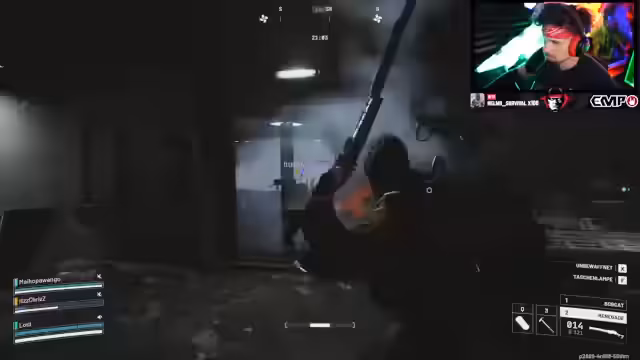 08:22:45Die Spieler koordinieren einen Push durch eine Map. Der Streamer verteilt Anweisungen, seine Teamkollegen sollen rot oder blau markieren und Bestfighter-Punkte sammeln. Es kommt zu mehreren Feuergehalten mit gegnerischen Teams, wobei man auf Minen, Granaten und Hinterhalte achten muss. Die Kommunikation ist entscheidend, um Angriffe von verschiedenen Seiten abzuwehren und den Gegner durch taktische Rauchgranaten einzuschränken.