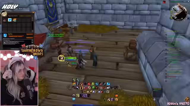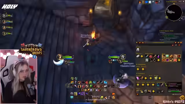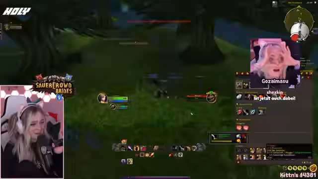 00:19:44Nach der Sticker-Verlosung wechselt die Streamerin zum Spiel World of Warcraft. Sie startet einen Hardcore-Raid und ist amüsierend über eine erneute Einladung einer Person, die sie bereits eingeladen hatte. Der Stream spielt sich in den Dungeons Schattenfeste Krypta (SFK) und Blackfathom Tiefen (BFD) ab. Die Gruppe besteht aus Krieger, Paladin, Mage, Schurke und Druiden, wobei einiger Frust über verlorene Loots und Todesfälle in früheren Runs zum Ausdruck kommt.
