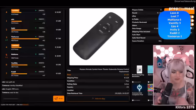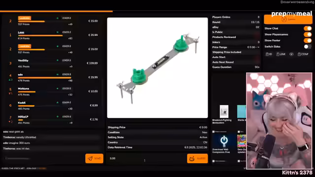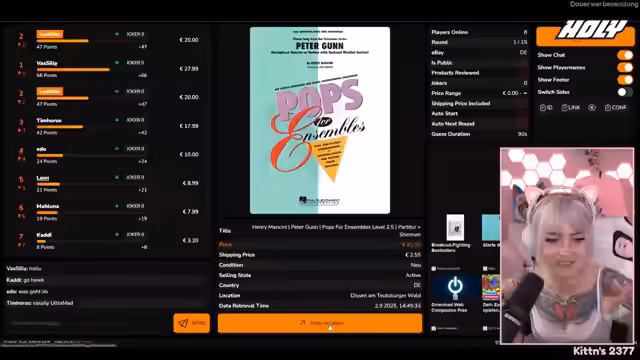 02:12:11Es wird sich bei allen bedankt, dass sie da sind und sich die Zeit genommen haben, insbesondere bei Edo, der es vergessen hatte. Es wird erklärt, dass aufgrund technischer Probleme kein Punkte-Overlay verwendet werden kann, daher wird einfach so gespielt und jeder zählt seine Punkte selbst. Es wird mit 'Guess the Price' begonnen, bei dem eBay-Produkte aus Deutschland geschätzt werden müssen, die neu, gebraucht oder beschädigt sein können. Es wird erklärt, dass der Verkaufsstatus angezeigt wird, um bei der Schätzung zu helfen. Es wird eine Bedenkzeit von 90 Sekunden eingeräumt, um über die Produkte zu sprechen und zu überlegen. Die erste Runde beginnt mit einem musikalischen Produkt namens 'Peter Gun', bei dem der Preis geschätzt werden muss. Es wird überlegt, ob es sich um ein Sammlerstück handelt und wie der Verkaufsstatus zu interpretieren ist. Die Versandkosten werden ebenfalls berücksichtigt.