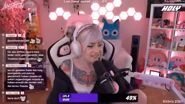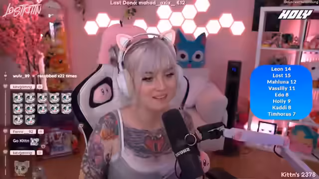lostkittn hatte anfängliche technische Schwierigkeiten mit den Kopfhörern. Ein Clip-Pony wurde präsentiert und Haarfarben-Experimente diskutiert. Die Unterstützung der Zuschauer wurde mit einem Offline-Hype-Train Level 14 gefeiert. Ein IRL-Stream mit Lilly ist in Planung. Spongebob Merchandise, Holy Produkte und Guess Games mit Bonjivor standen im Fokus.