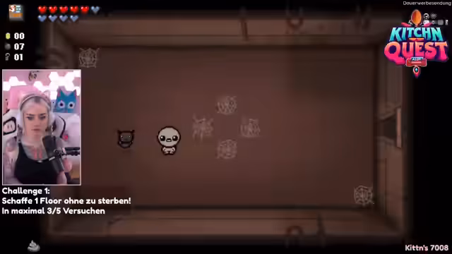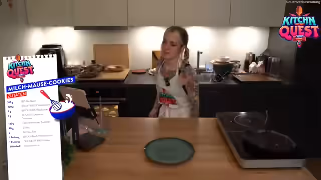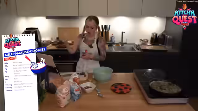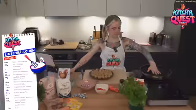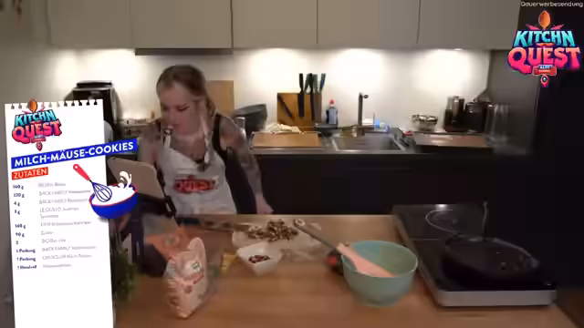 00:18:32Der Hauptinhalt des Streams wird als Kitchen Quest in Zusammenarbeit mit Aldi Gaming angekündigt. Die Streamerin stellt zwei Rezepte vor: Linsenbällchen in Chilitomatensoße und Milchmäuse-Cookies. Das Format kombiniert Gaming mit Kochen. Zuerst muss sie eine Challenge im Spiel 'The Binding of Isaac: Rebirth' meistern. Gelingt ihr dies, darf sie normal kochen. Scheitert sie, erhält sie vom Chat eine zusätzliche, das Kochen erschwerende Aufgabe.