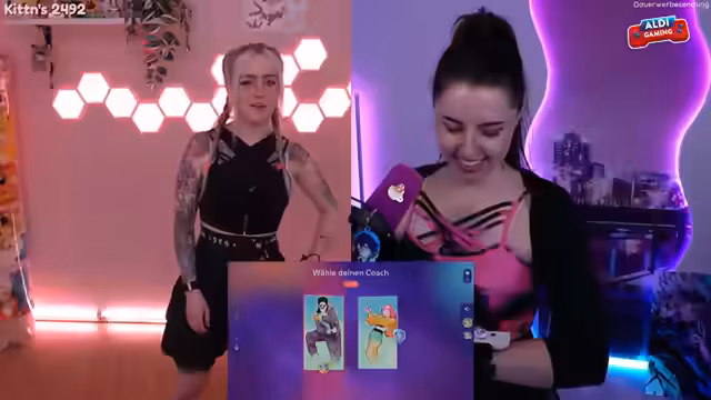 00:30:56Der eigentliche Just-Dance-Stream beginnt mit Lilly. Die Streamerin stellt die virtuelle Kamera ein und positioniert beide Streamer so, dass sie beide gleichzeitig zu sehen sind. Es kommt zu technischen Anpassungen bei der Tonausgabe, damit die Stimmen der beiden nicht doppelt zu hören sind. Die Streamerinnen führen einen Outfit-Check durch und sind beide motiviert für die gemeinsamen Tänze.