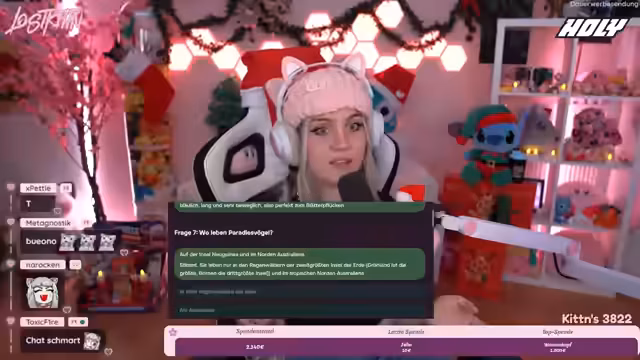 01:33:20Nach dem ersten Spendenaufruf führt der Streamer ein Quiz durch, das neben tierischen auch allgemeine naturkundliche Fragen enthält. Die Fragen reichen von giftigen Spinnen in Südamerika bis hin zur Flugweise von Kolibris. Die Zuschauer werden aktiv in die Quiz-Runde eingebunden und stimmen per Live-Poll ab. Der Streamer interagiert dabei humorvoll mit dem Chat, gibt Anleitungen und kündigt an, dass eine Teilnahme an der Quiz-Runde zur Spendenaktion gehört. Diese Runde dient der Unterhaltung und Community-Bindung.
