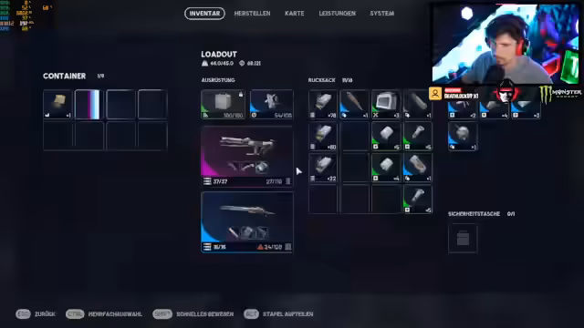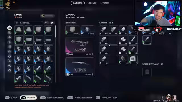 01:32:46Der Streamer navigiert erfolgreich durch ein Extraction-Spiel und demonstriert die Mechaniken des Inventarmanagements. Er erklärt das Prinzip des Auspackens von Rucksackinhalten in den Stash, das Platzproblem und das sich daraus ergebende Tetris-ähnliche Gameplay. Wichtig sind dabei Tastenkombinationen wie die Mehrfachmarkierung mit der Strg-Taste und das schnelle Verkaufen von Items durch Rechtsklick. Es wird der Recycling-Prozess von Waffen und die erhaltenen Komponenten wie mechanische Teile erläutert, die für Reparaturen oder Upgrades benötigt werden.
