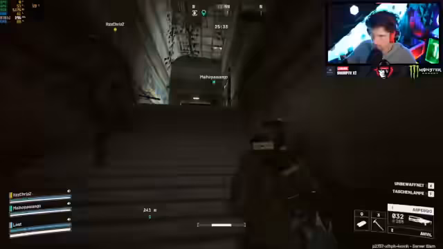 02:59:59Nach einem scheinbaren Sieg bemerkt der Streamer, dass ein Gegner mit einer 'Rocketeer'-Waffe noch aktiv ist. Ein taktischer Rückzug in einem Aufzug bietet die Möglichkeit, den Gegner zu isolieren oder mit ihm zu verhandeln. Gleichzeitig wird eine Einladung für einen anderen Streamer namens Chris ausgesprochen, um gemeinsam eine Runde zu spielen und den Inhalt zu variieren.