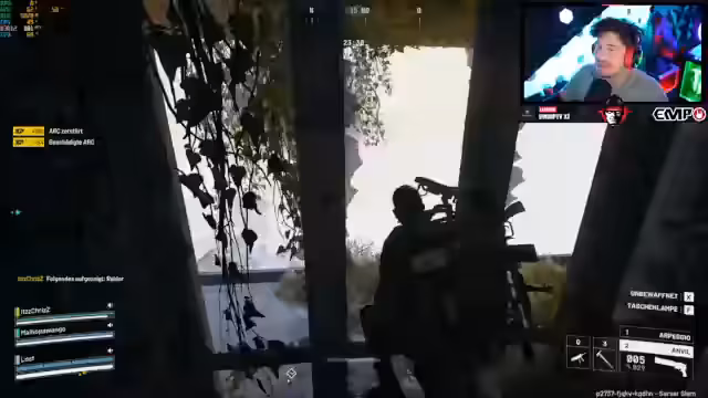 05:57:25Der Streamer befindet sich in einem gefährlichen inneren Bereich des Spieles, als mehrere Gegner gleichzeitig auftauchen. Er fokussiert sich darauf, seine Teamkameraden, insbesondere 'Chris', zu schützen und aktiviert seine Spezialausrüstung, um den Kampf zu meistern. Mehrere Gegner werden ausgeschaltet, und der Streamer lootet daraufhin die fallen gelassenen Gegenstände wie grüne Schilde, ein Raupen-Schaltteil und einen Schalldämpfer.