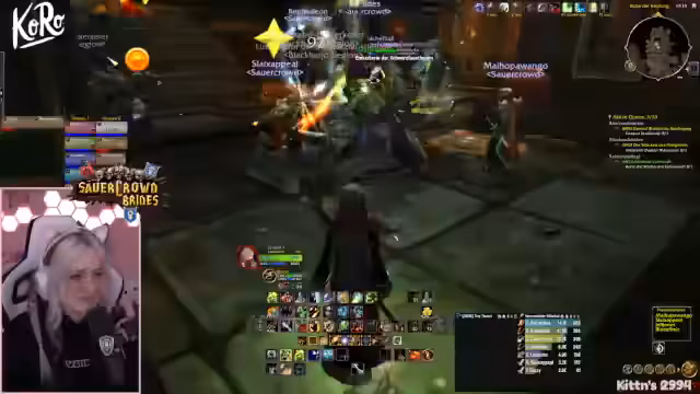 02:34:24Zu Beginn des Raids erklärt die Streamerin grundlegende Mechaniken der ersten Bosse. Sie weist die Spieler darauf hin, die Tanks im Auge zu behalten, und fordert sie auf, sich von der Eingangstür wegzubewegen, um nicht überrollt zu werden. Sie beschreibt die Mobs, ihre Fähigkeiten und die Notwendigkeit, bestimmte Runen auf dem Boden zu unterbrechen, wobei die Magier hier eine Schlüsselrolle einnehmen. Auch die Koordination wird thematisiert, da ein 'Caller' die Taktiken vorgeben sollte, um Chaos zu vermeiden.