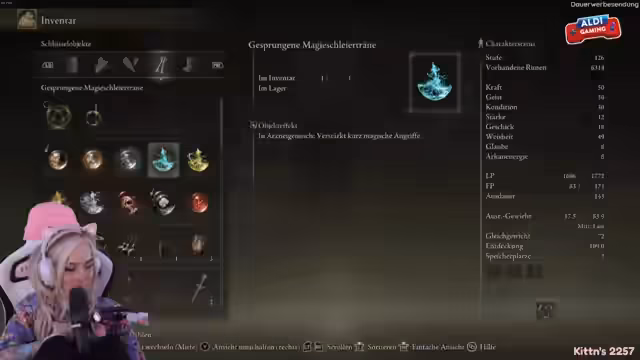 Während des Streams wurden neue Power-ups für das Spiel gesammelt. In der Region Lyurnia wurde nach dem buffenden Item Kriegsasche gesucht, bevor es den Weg in den Norden zur Magie-Schleier-Träne ging. Nachdem die Navigation durch das feindliche Terrain gemeistert wurde, erfolgte die Vorbereitung auf den bevorstehenden Bosskampf.