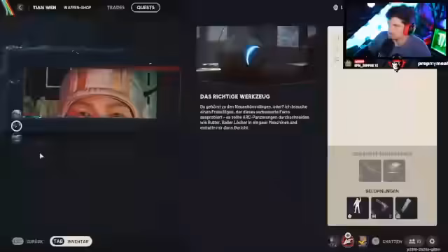 15:46:46In der späteren Phase des Streams steht die Vorbereitung für eine Prestige-Quest im Fokus. Die Protagonisten organisieren sich Waffen wie eine Tempest und eine Anvil, was Platzprobleme im Inventar verursacht. Sie sammeln Schlüssel, darunter einen Rathaus- und Wohneinheitenschlüssel, und planen, mit drei Kabeln ein Sonarpanel reparieren zu müssen. Die Suche nach blauen Planen für eine geschützte Dachterrasse beginnt, während der Streamer einen halbwegs humorvollen Moment als Green Beret imitiert.